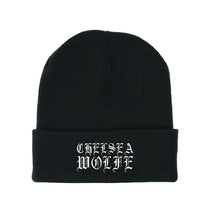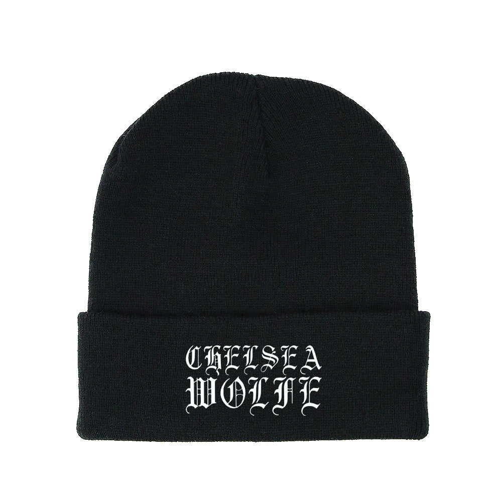 Black beanie with embroidered CHELSEA WOLFE logo.